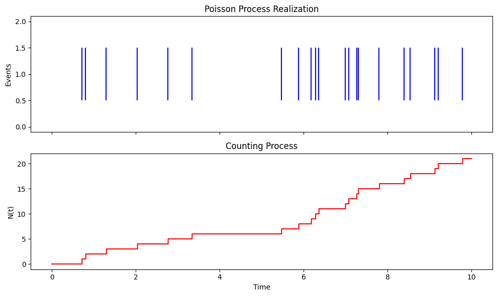 Here is one example of a realisation of a point process and the corresponding counting process representation: