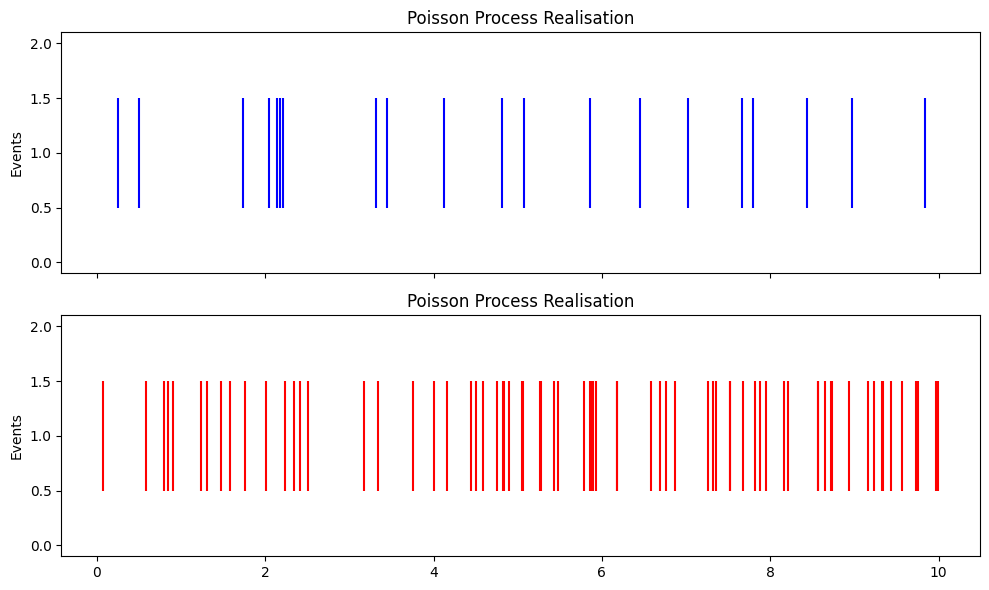 At its core, a point process is a random collection of points in some space, in our case, time. A point process in space could be where a raindrop hits the ground, for example. When modelling Order-Flow, each event happens at a specific time, and the pattern of these occurrences is random rather than deterministic.