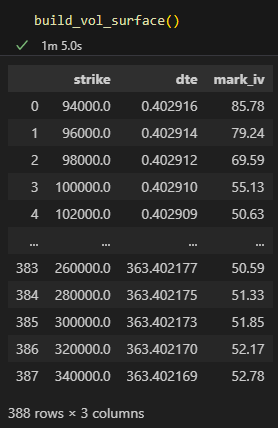 return front_expiry_dfThis gives us the following dataframe if we run build_vol_surface():